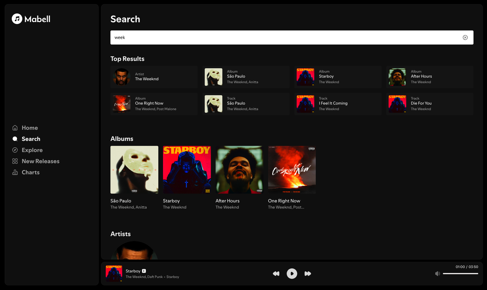Leveraging Typesense, the project includes an advanced search engine capable of delivering quick and relevant results, even with a large catalog of music. The search supports typo tolerance and allows users to filter and sort by genres, artists, and albums.
